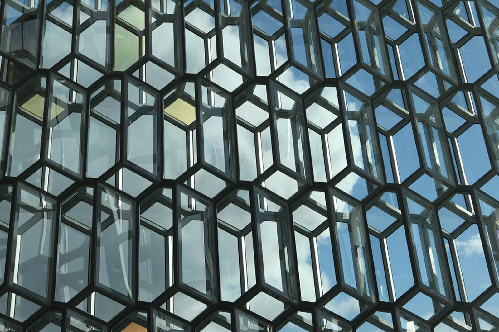 Reminiscent of the crystalline basalt columns commonly found in Iceland, the geometric facades of Harpa are based on a modular, space-filling structure called the quasi brick. The quasi brick modules incorporate panes of colour-effect filter glass; the building shimmers, reacting to the weather, time of year or day, and the position and movements of viewers.