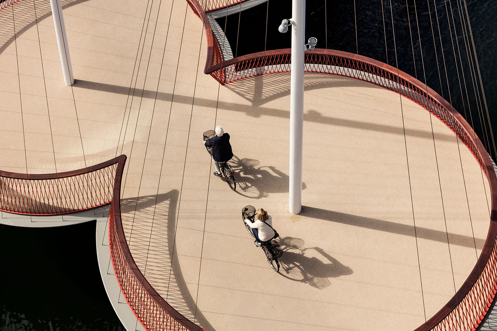 Based on the Christianshavn district's maritime history and culture, Olafur Eliasson used the sailing boat as the visual point of departure for the design of Cirkelbroen. The bridge consists of five staggered circular platforms of various sizes, each with its own 'mast.' Thin steel cables extend from the tops of the masts – the highest of which rises up twenty-five metres – to the platform's circular railings. The five steel platforms vary in diameter from ten to fourteen metres and are arranged to create a staggered, zigzag path that inspires uncertainty and pause.