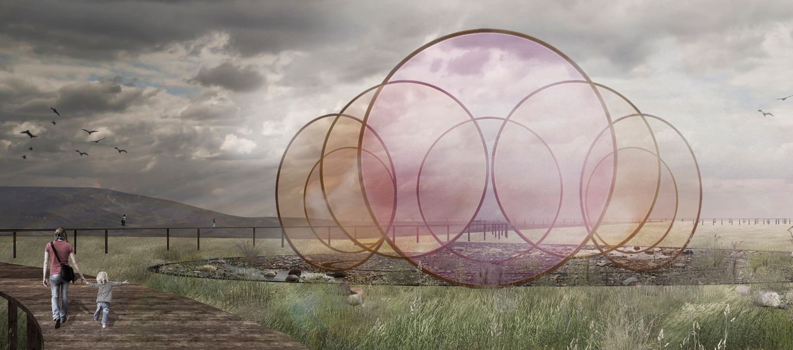 Central to the pavilion's design is the act of walking. The structure is not conceived to be a single, static point along the path, but rather to follow the shifting perspectives of a journey through the landscape. As visitors move along the bridge, the pavilion materialises and evolves. Approaching from either direction, people reach a point where the seemingly scattered distribution of rings suddenly coheres into a symmetrical pattern – a vision of harmony shared by visitors from the south and the north.