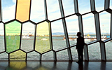 Reminiscent of the crystalline basalt columns commonly found in Iceland, the geometric facades of Harpa are based on a modular, space-filling structure called the quasi brick. The quasi brick modules incorporate panes of colour-effect filter glass; the building shimmers, reacting to the weather, time of year or day, and the position and movements of viewers.